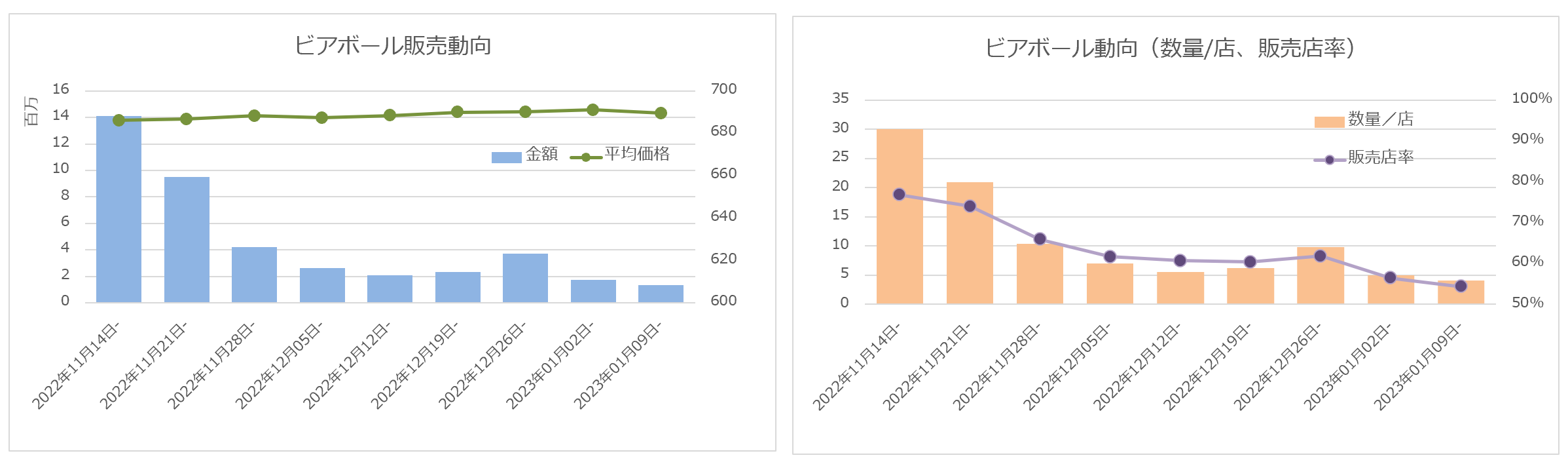 発売開始後9週間のデータでは、発売初週の売上が最も高く、その後低下傾向。年末週に盛り上がるが、年明け後盛り上がりは継続せず。(左図)