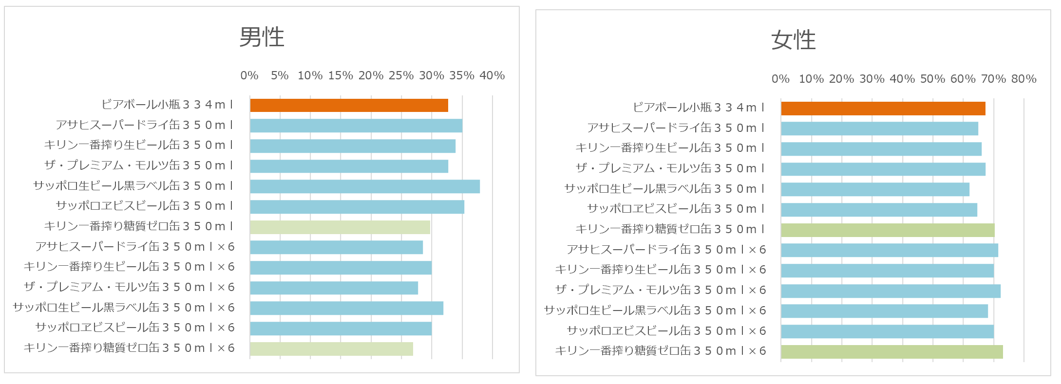 年代別では、大きな違いがみられる。特に40代以下の構成比が高く、ビールカテゴリーになじみが薄い年代の取り込みに成功しており、新カテゴリ創出からカテゴリーの活性化につながっていると推測される。
