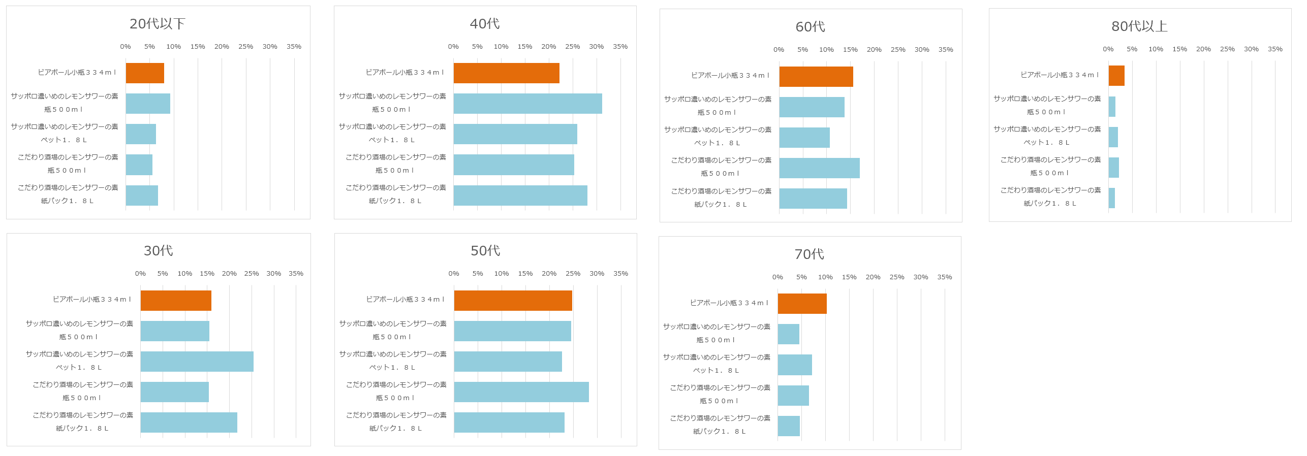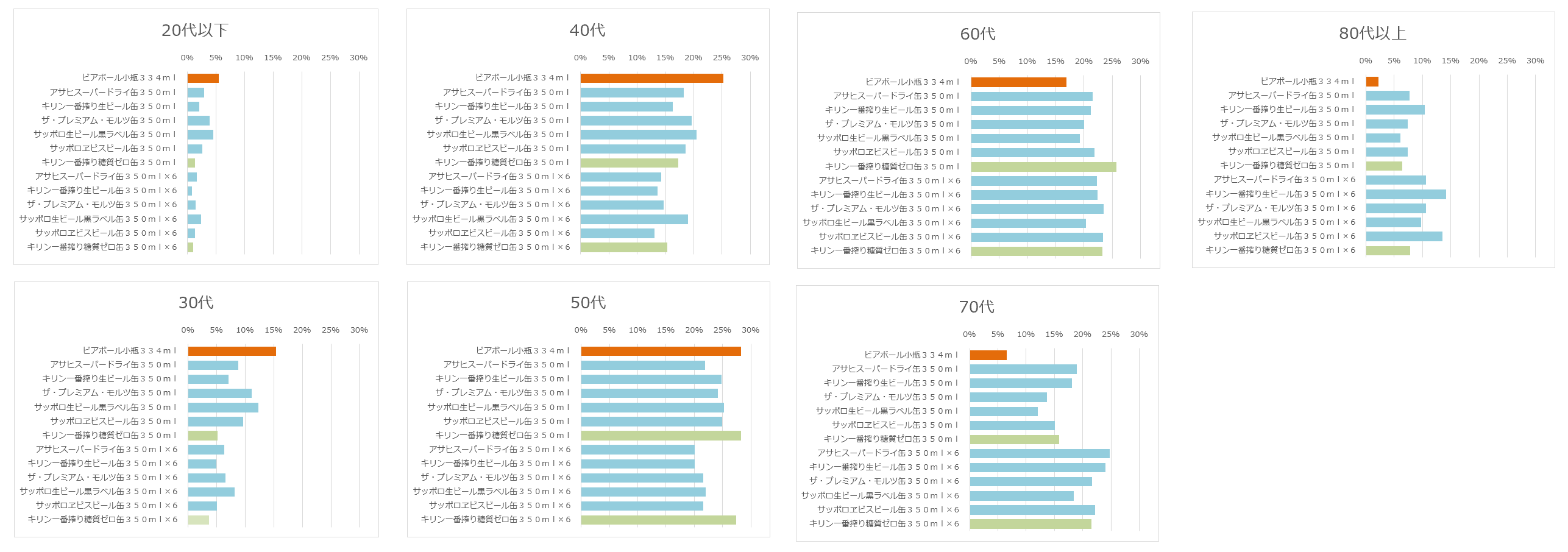 年代別では、ビール上位品ほどの大きな違いは見られない。40代以下は少なめ、50代・60代は同程度。70代以上は多め。
