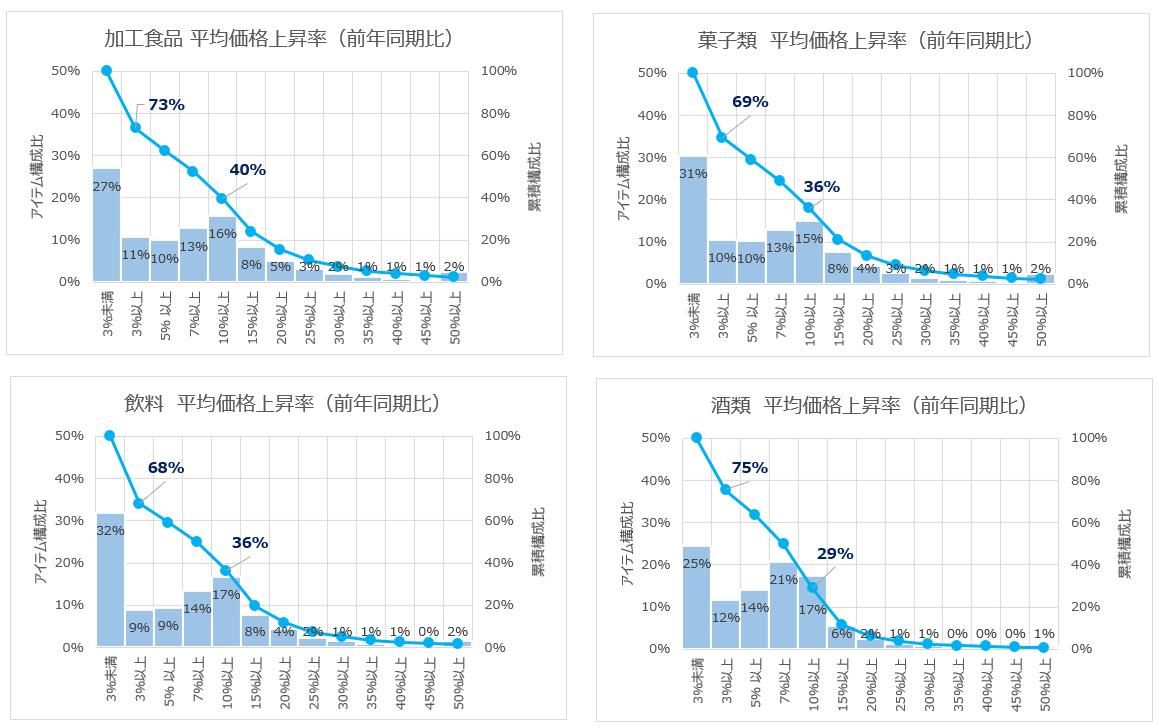 次に、アイテムの平均価格上昇率を見ると、各分類ともおよそ70%以上の商品が3%以上値上げした。