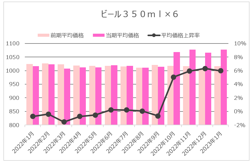 2022年9月までは前期比マイナスだが、2022年10月に5%上昇。2023年1月の上昇率は6%(前期平均価格1017円→当期平均価格1078円)。