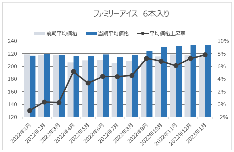 2022年4月に5%上昇。夏場は上昇率が3~4%台にダウンしたが、2023年1月の上昇率は8%(前期平均価格217円→当期平均価格234円)。