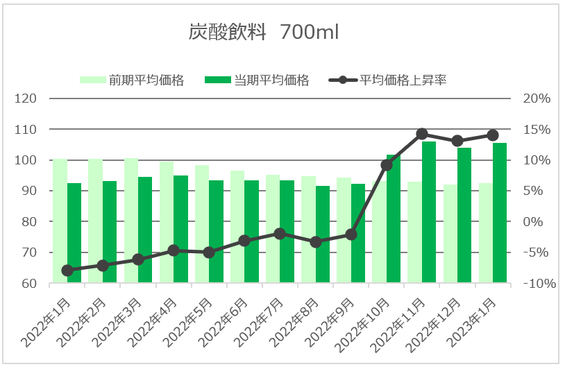 2022年9月まで平均価格は前期比マイナス。2022年10月に9%上昇。その後上昇し、2023年1月の上昇率は14%(前期平均価格92円→当期平均価格105円)。