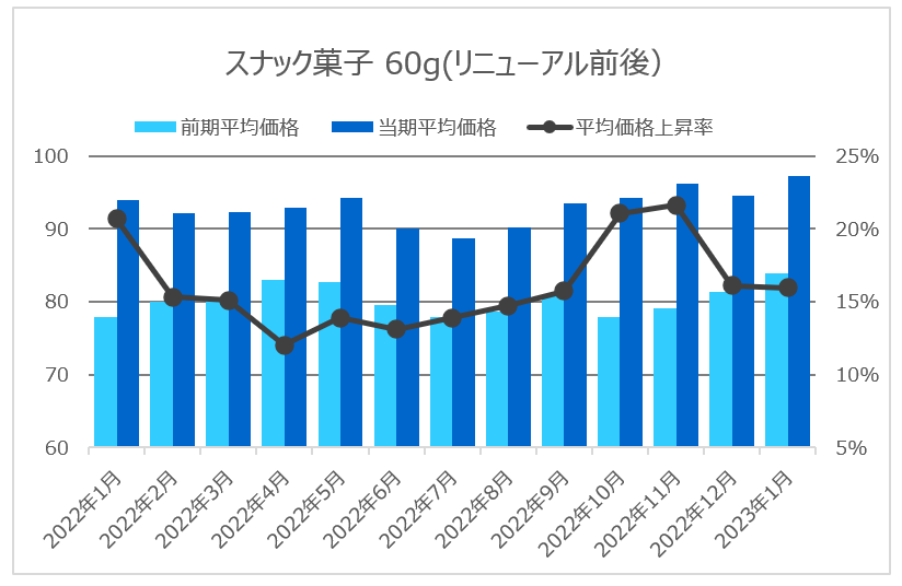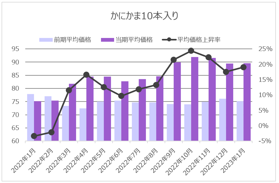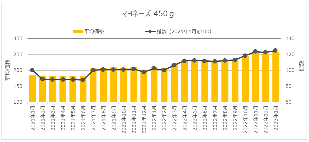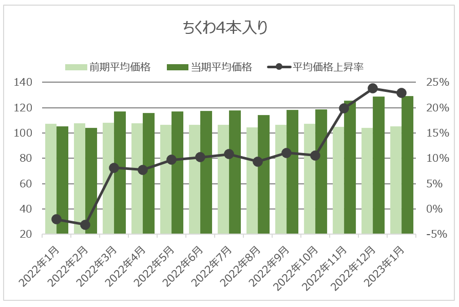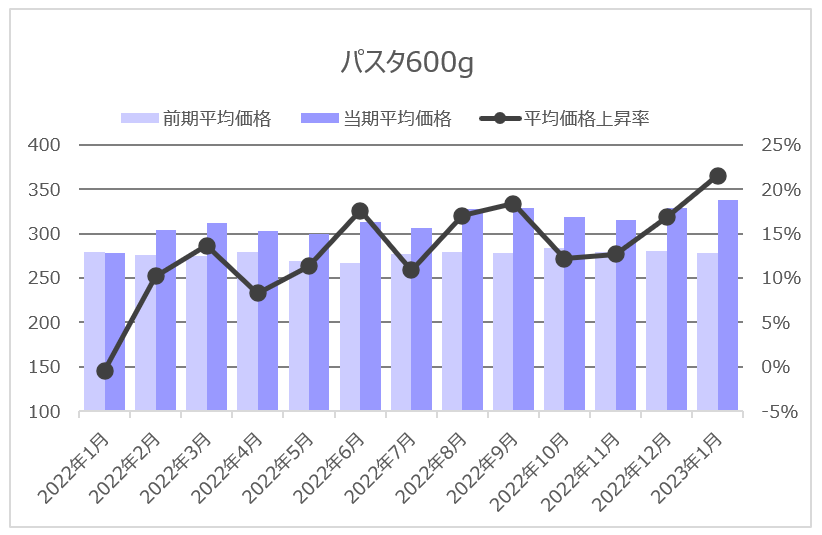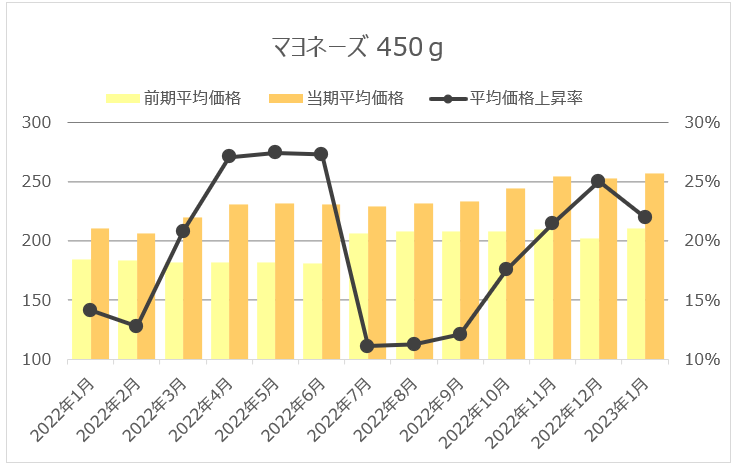 2022年2月に10%上昇(前期平均価格213円→当期平均価格236円)。2022年10月以降上昇率が1段上がり、2023年1月は16.6%となっている(前期平均価格222円→当期平均価格259円)。
