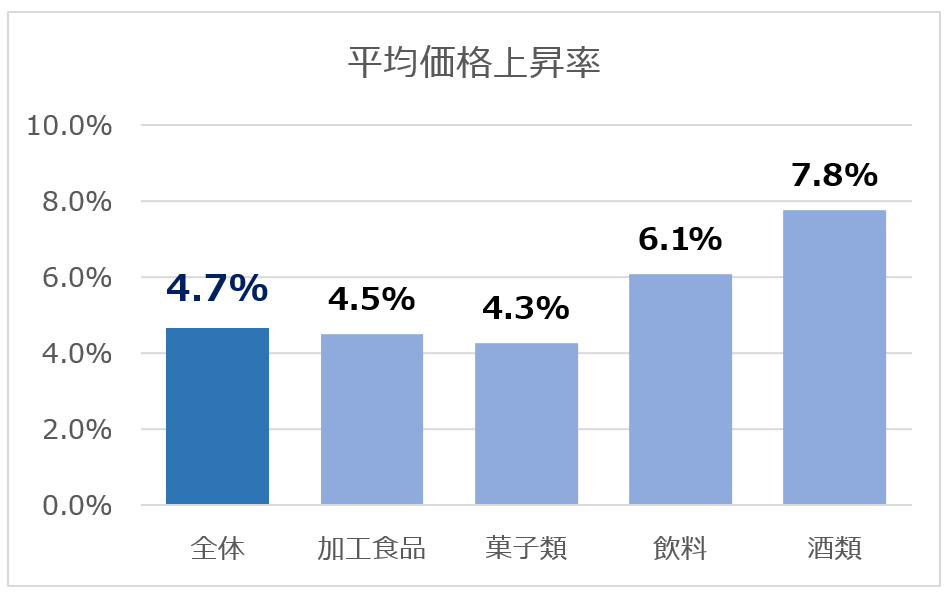 2023年1月の速報データでは、食品全体で4.7%の上昇率となった。酒類は7.8%で大幅上昇。