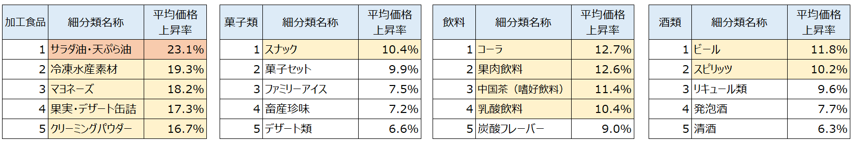 加工食品:2021年以降主要メーカーが5回程度値上げを発表したサラダ油・天ぷら油の上昇率23.1%。冷凍水産素材、マヨネーズなども2桁の上昇率となっている。