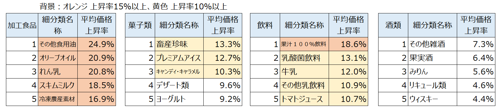 細分類の平均価格上昇率上位は下記の通り。(主要細分類)