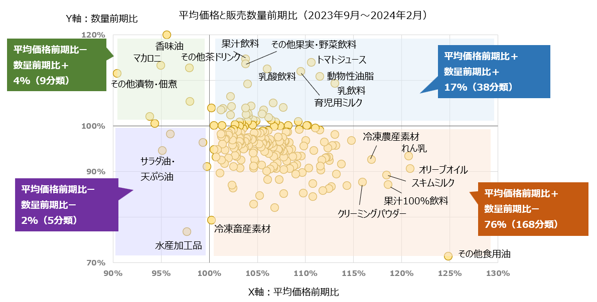 2023年9月~2924年2月のPOSデータから、価格の上昇率は頭打ちと見られるが、明確に値上げが一服したと言える状況ではない。