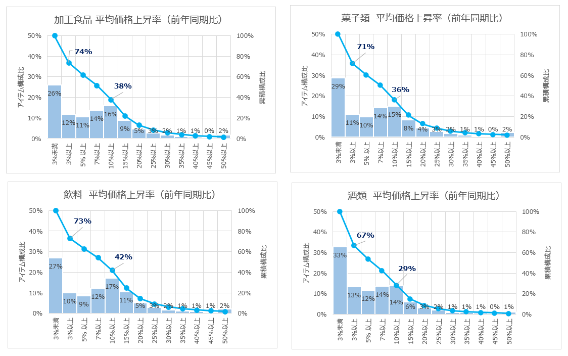 加工食品・菓子類は40%弱、飲料は42%、酒類は29%の商品で上昇率2桁。着実に数は減っているが、値上げ状況は変わらない。