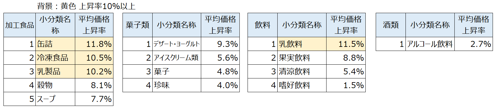 次に、値上げ率の高い分類を見てみる。