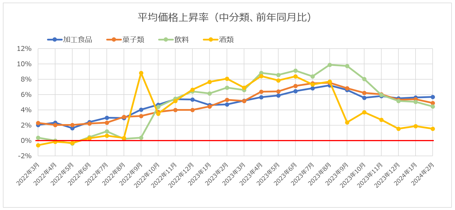 - 加工食品・菓子類:値上げ率はほぼ一定ペースで上昇。2024年に入り5~6%弱で推移。