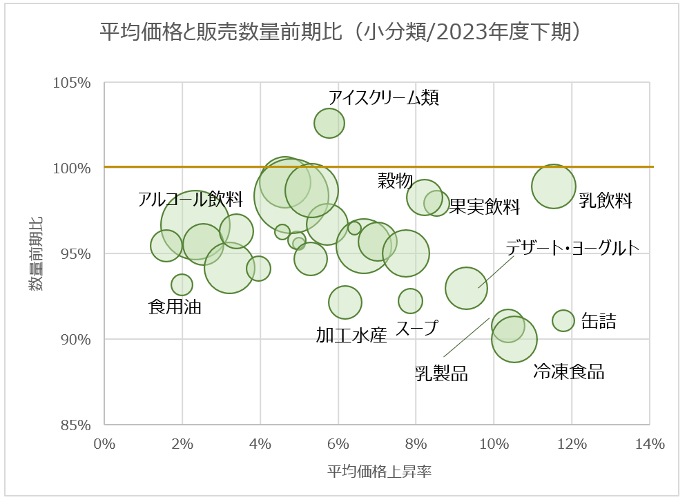 今回は、2023年度下期(2023年9月-2024年2月)最新の値上げ実態と販売の変化を見ていきます。