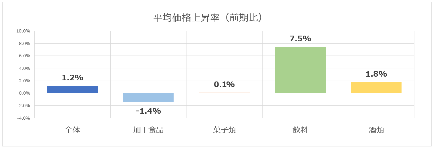 当期は、食品全体で前期比1.2%の価格上昇率となった。飲料大手各社が値上げを発表していたことから、飲料は7.5%と高い上昇率。加工食品のマイナスは特売などの影響と推測される。