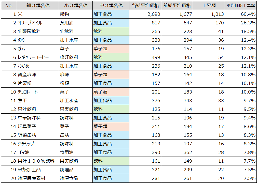 米の値上げは報道されている通りだが、カテゴリー平均価格は60%の大幅上昇オリーブオイルも26%と高い上昇率となっている。