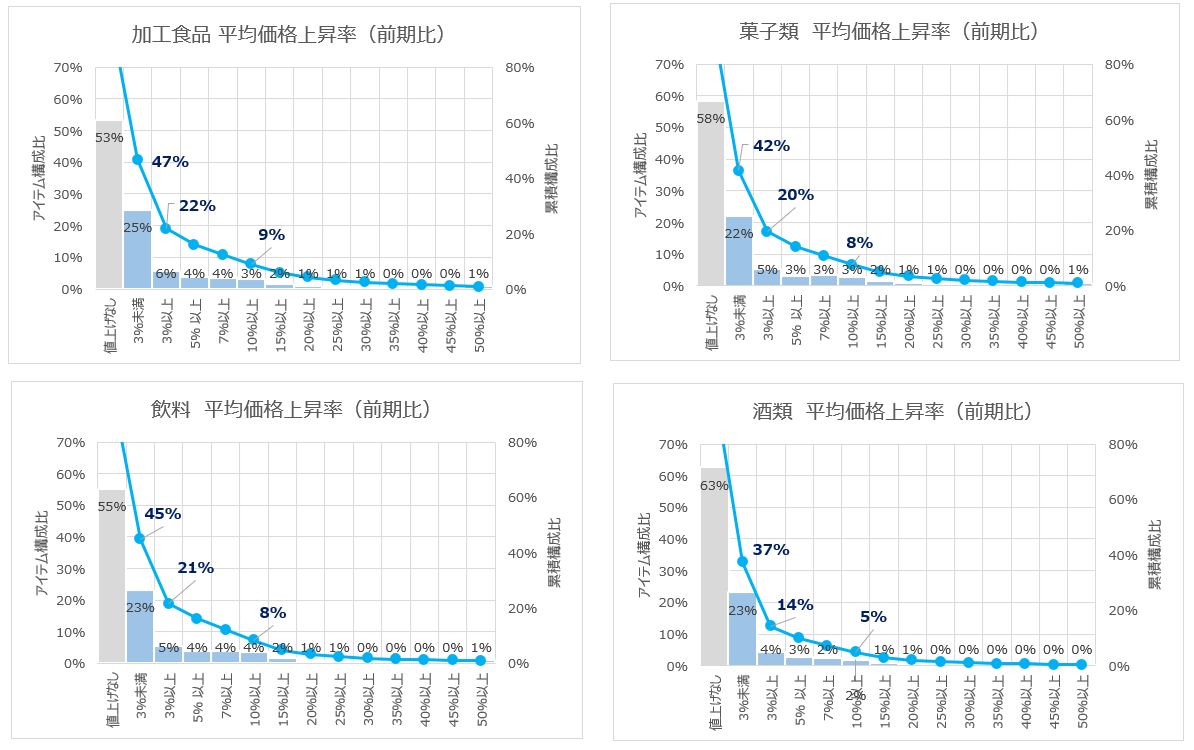 半数以上の商品は値上げなし。加工食品、菓子類、飲料は20%前後の商品で平均価格が3%以上上昇