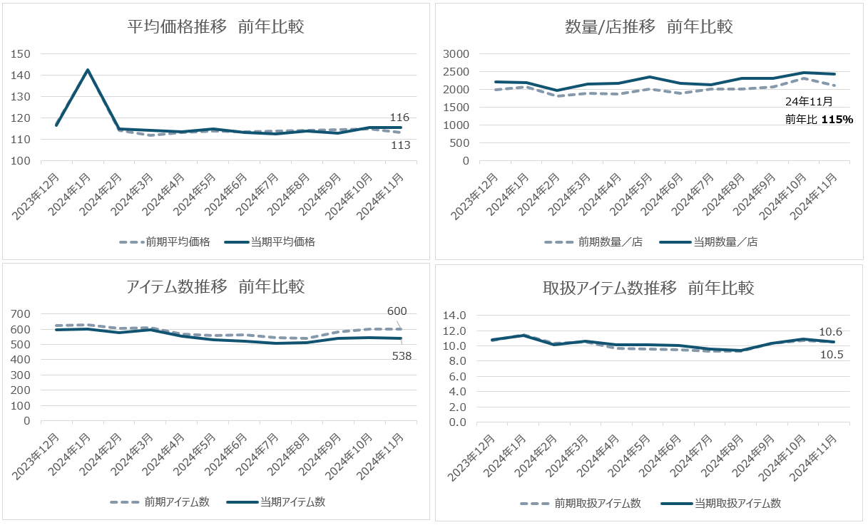 カット野菜は金額数量共に前年比プラスで推移している。2024年11月は前年比2桁アップで好調が目立つ。平均価格は116円。前年と比べると3円アップしているが、年間を通して前年との平均価格差は大きくない。簡便さに加え、生鮮食品と比較すると価格が安定しているカット野菜は、数量/店が115%となっている。出現しているアイテム数は前年よりも少ないが、店頭での取扱アイテム数は減っておらず、回転の良さ(数量/店のプラス)が金額数量の売上プラスの要因となっている。