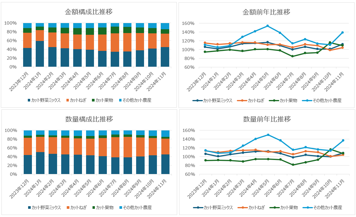 カット野菜の中で売上の構成が大きいのはカット野菜ミックスとカットねぎ。この二つでカット野菜全体の80%以上の数量を占める。カット野菜ミックス、カットねぎ共に前年比はプラス基調。12ヶ月累計の金額前年比はカット野菜ミックス107%、カットねぎ110%。前年比のプラスが大きいのは、その他カット農産で、ここにはキャベツや白菜などが含まれる。その他カット農産の12ヶ月累計の金額前年比は123%。カット果物は他のカット野菜よりも価格帯が高い。カット果物以外は100円程度で推移している中、カット果物は250~300円の間。また、8月までは前年よりも10円以上高い平均価格であったため、数量前年比はマイナスが続いていた。直近では前年の価格に近付いており、売上もプラスになった。