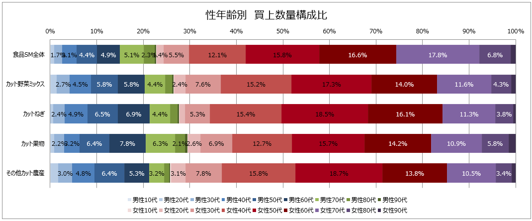 それぞれのカット野菜を誰が購入しているのか、I分析を用いて性年齢別の買上構成比を確認してみる。データのサンプルである食品SMの特性もあり、女性の買上構成比が高いが、食品SM全体の構成と比較すると、カット野菜は男性の構成比が高い。また50代以下で食品SM全体よりもプラスになっている。野菜を買って切る事に比べると割高だが簡単便利なカット野菜は、男性支持されている&年齢層が高い世代からの支持は高くない事がわかる。60代では、女性は食品SM全体よりも構成が低いが男性は高いという結果になり、男女で異なる結果になっている。また、年齢が高まるにつれて支持が低くなるカット野菜であるが、カット果物においては70代男性の構成が6.3%あり、食品SM全体よりも1.2%高い。細分類別、年代別、男女別で様々な違いが見受けられる。
