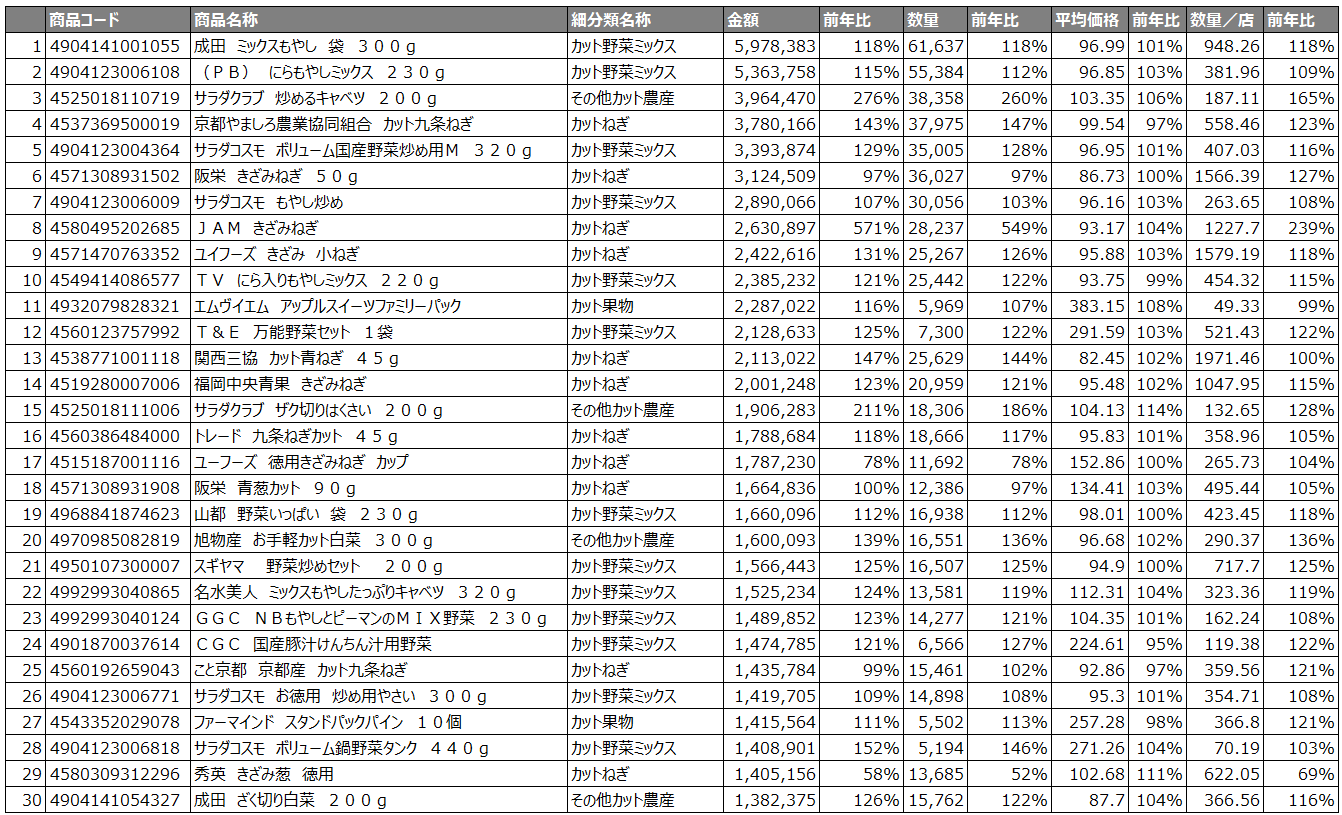 上位30商品中26商品で金額数量共に前年比プラス。