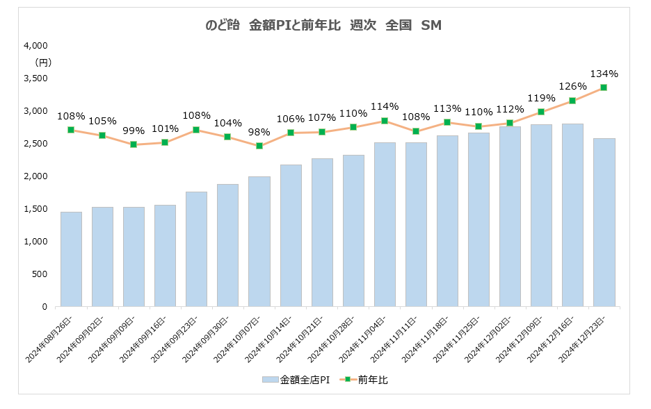 - のど飴の食品スーパー(食品SM)とドラッグストア(DgS)における月次の金額PIはほぼ同様の動きを示しており2024年前半、前年から2桁の伸びで推移し秋口に1桁になったが、11月に再び2桁に転じ、12月には共に前年比120%に達した。2024年12月の食品SMにおける金額PIは約2,700円に対しドラッグストアは6,300円で、ドラッグストアの売上が40% 以上高い。