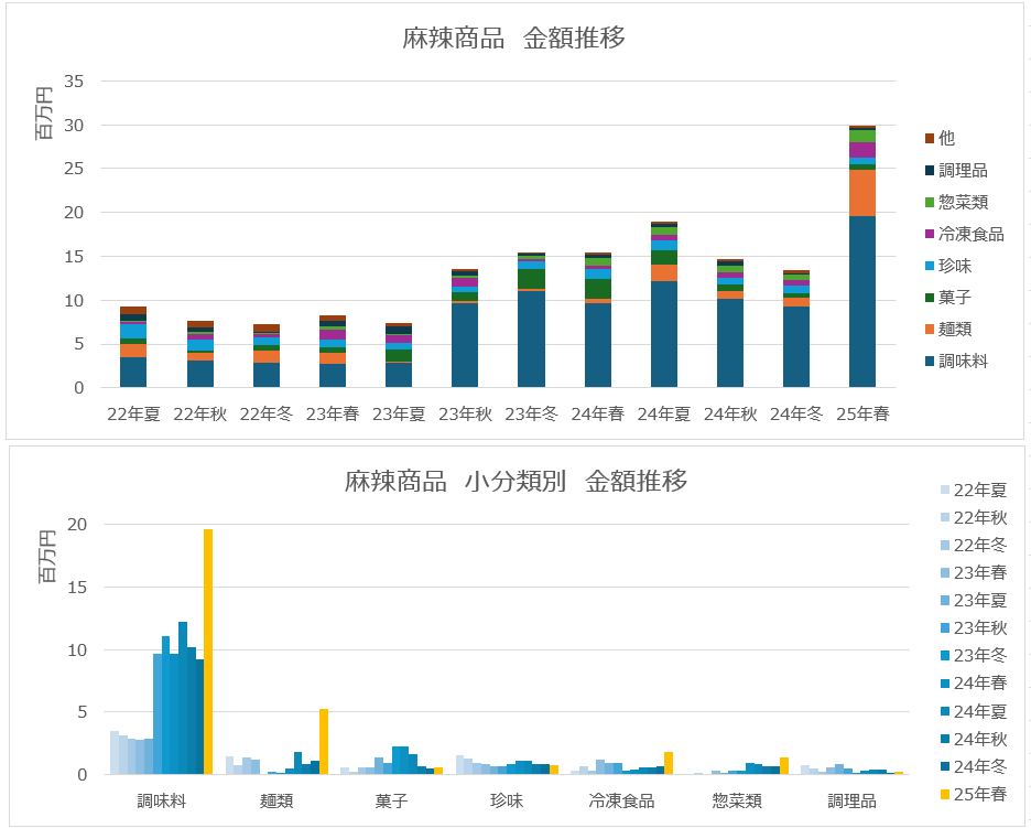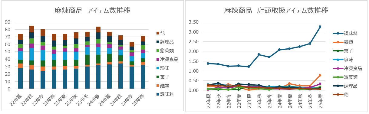 食品SMにおいても商品名に「麻辣」「マーラー」を含む「麻辣商品」は、売上が拡大しており、25年春(25年3~5月計)は24年冬(24年12月~25年2月)と比較して金額比223%と大きく拡大している。中でも調味料と麺類での拡大が大きい。アイテム数を22年夏以降の長期経過で見ると、直近で特に多くなっている訳ではないが、店頭取扱アイテム数では25年春が最大。人気に伴って、店頭での扱いが増えている事が推測される。