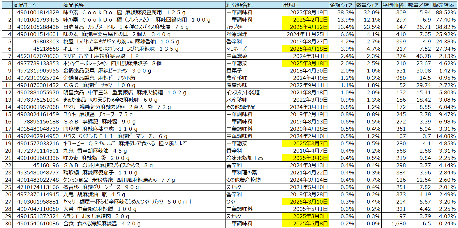 2025年5月の麻辣商品のアイテムランキングを見ると、上位10商品のうち2025年以降に出現した新商品は4商品。売上、店頭取扱アイテム数共に直近で増加していた調味料、麺類はそれぞれ「CookDo極麻辣回鍋肉用」と「カップヌードル14種のスパイス麻辣湯」の影響が大きい事がわかる。また、調味料ではキユーピーから麻辣味のマヨネーズが発売されており、27%以上の販売店率となっている。