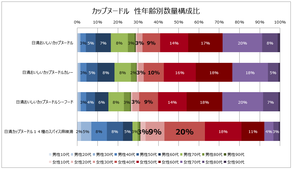 カップヌードルで通常の商品と麻辣湯の購入者を性年齢別数量構成比で比較すると、麻辣湯は男性では50代以下、女性では40代以下で数量構成が大きい。定番品3品の性年齢別数量構成比はほとんど差がなく、メイン購入層(最も構成比が高い層)は70代女性。これに対して麻辣湯は40代女性の構成が最も大きく、ターゲットが大きく異なっている事が分かる。女性30代40代は、定番3品では全体の13%ほどであるが、麻辣湯では倍以上の29%を構成。
