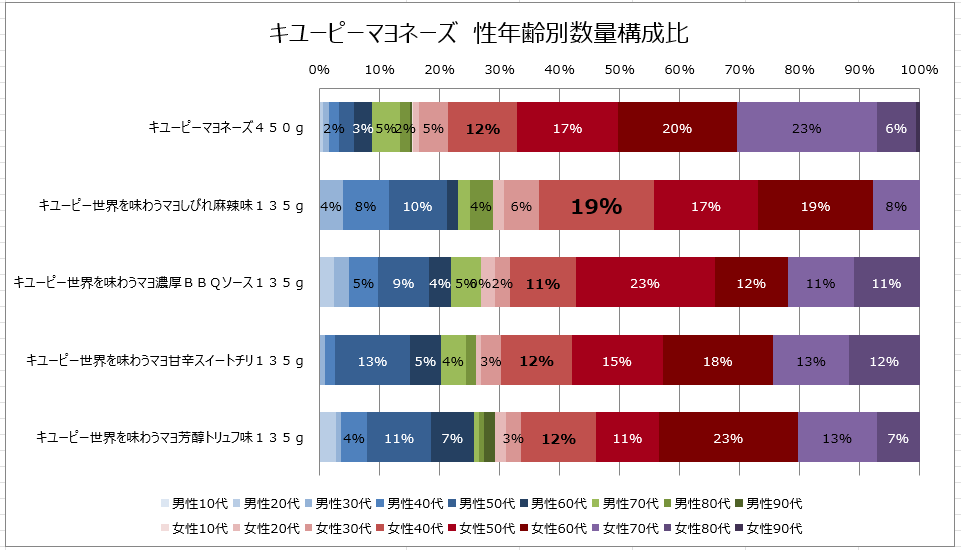 キユーピーマヨネーズで性年齢別数量構成比で比較すると、カップヌードルと同じく麻辣味は女性40代での数量構成比の大きさが目立っている。