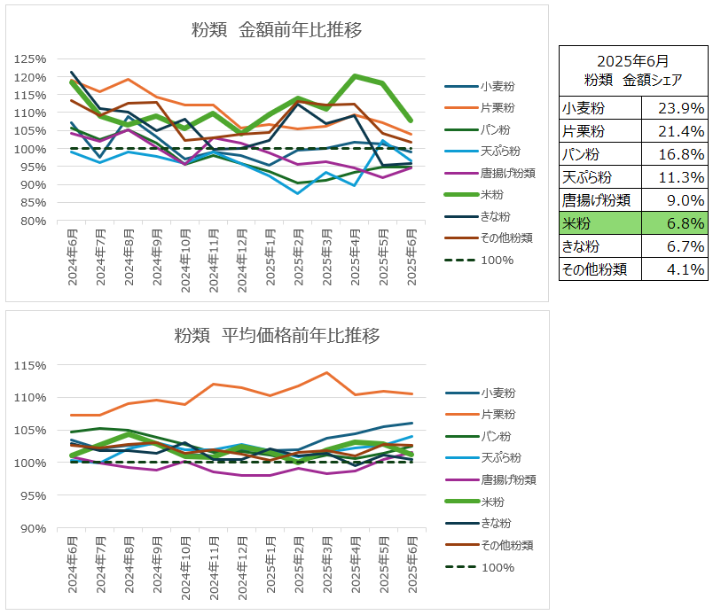 - 小麦粉や片栗粉の価格が上がっている中、米粉の価格は安定(平均価格前年比101%)