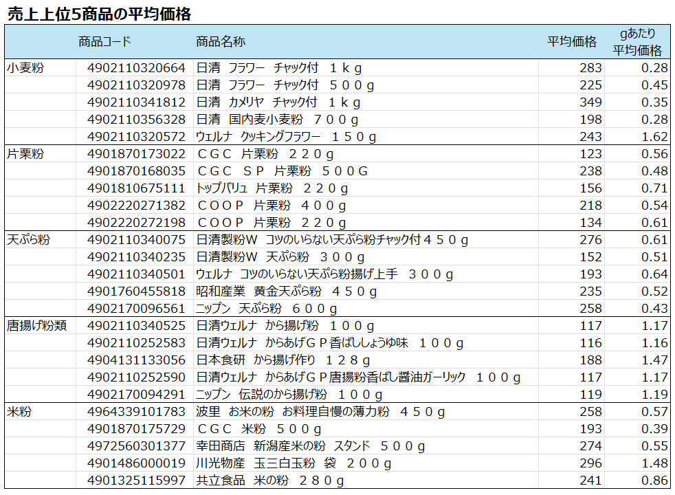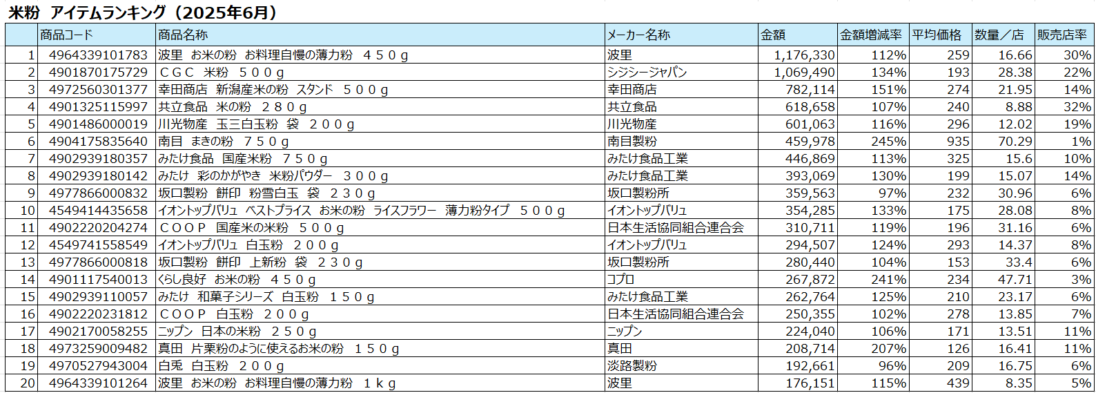 米粉の売上1位の商品は「波里 お米の粉 お料理自慢の薄力粉」で、お菓子作りから毎日の料理にも使える事を謳っている。上位20品は、白玉粉の2商品を除いて全て金額前年比プラスとなっている。