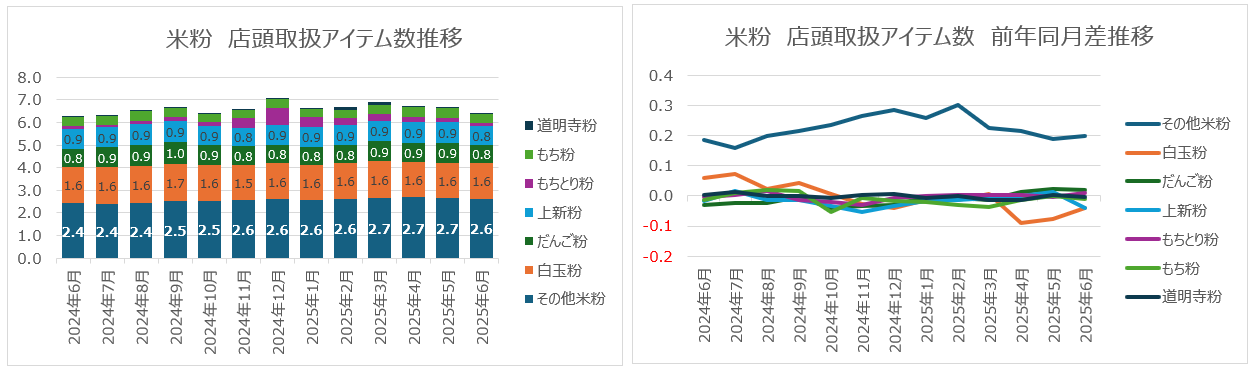その他米粉は、1店舗当たり平均2.6個の品揃え(2025年6月)。和菓子に用いられる米粉(白玉粉やだんご粉など)の店頭取扱アイテム数は前年とほぼ変わっていないが、その他米粉は前年と比較して0.2個増加している。