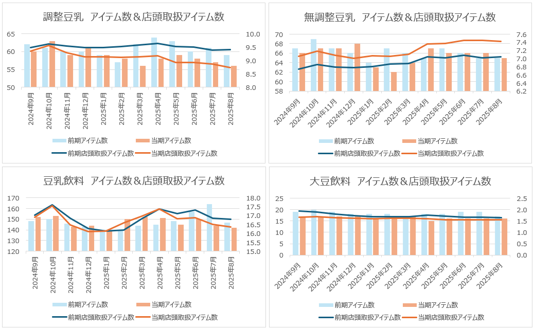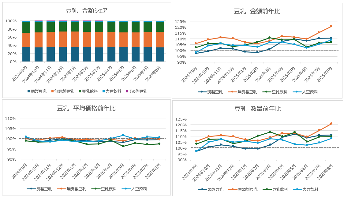 豆乳内の金額シェアは調整豆乳35%、無調整豆乳37%、豆乳飲料25%(2024年9月~2025年8月計)。豆乳はいずれの分類も前年と比較して価格は安定している。