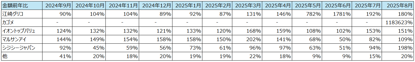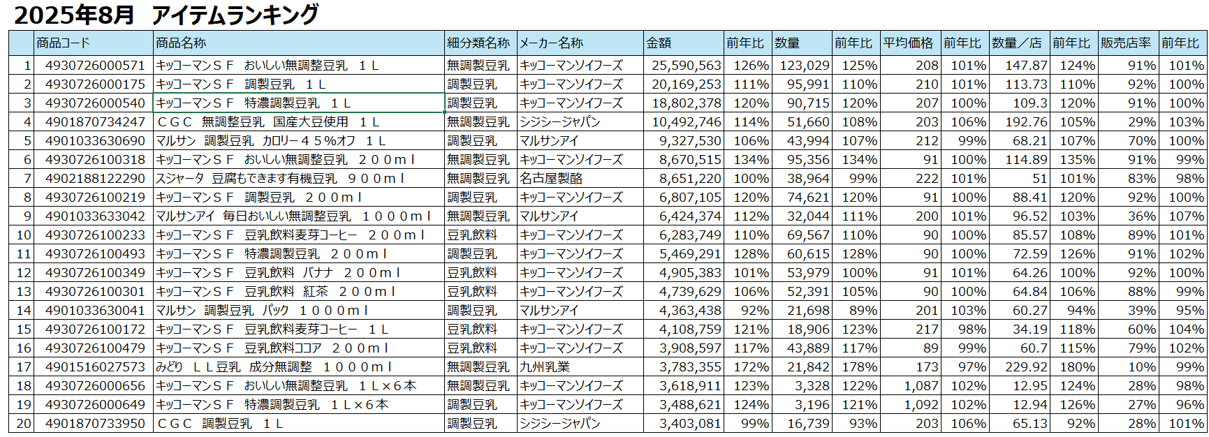 直近8月のアイテムランキングを見るとトップ10の商品は全て金額前年比プラス。キッコーマンソイフーズのおいしい無調整豆乳(1位、6位、18位)はいずれも金額数量共に前年比が120%を超えている。