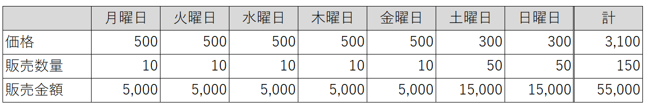 平均価格は、販売金額÷販売数量で計算するので、上記の場合、一週間の平均価格は、販売金額55,000÷販売数量150=平均価格367円になります。