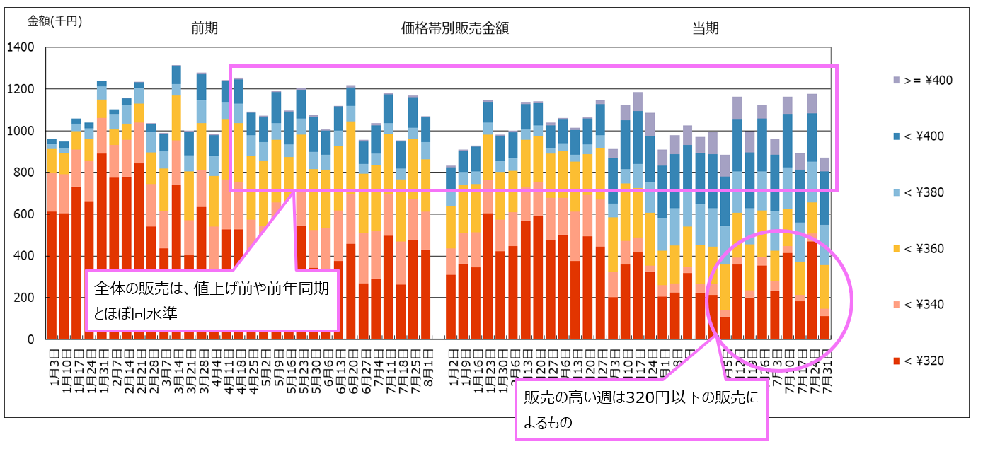 ただし、値上げ後で販売の高い週は例外なく320円以下の販売が大きくなっており、低価格販売による販売増をどのように判断していくかは、今後の課題と言えます。